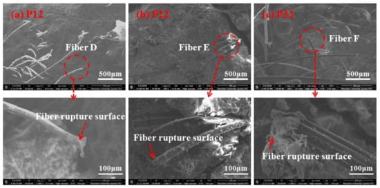 SEM images of fiber rupture surface: (a) P12; (b) P22; (c) P32 as marked in Figure 10d–f; respectively.