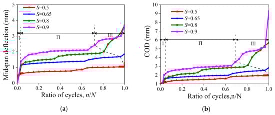 During the test, besides the midspan deflection, the crack opening displacement (COD) of the pure bending section was also measured with a LVDT installed parallel to the beam’s mid-span section as shown in Figure 6b. Figure 13 shows the evolution curve of mid-span deflection and the COD and ratio of fatigue loading cycles under different stress levels, where n is the number of loading cycles and N is the fatigue life of the specimen. This figure also shows that the midspan deflection and COD of the specimen increased with the increase of stress level. When the stress level is small, e.g., S = 0.5, the midspan deflection and the COD undergone two stages, namely rapid deformation growth (Stage I) and deformation stabilization (Stage II). The deformation mainly occurred in Stage I. The deflection in this stage included the elastic displacement of the specimen and deflection caused by the specimen cracking after dynamic disturbance. However, as the stress level increases, e.g., S = 0.65, 0.8 and 0.9, the whole deformation process can be divided into three stages: the above-mentioned Stage I and II, plus Stage III, where instability and failure occurred. The deformation occurred mainly in Stage I and Stage III. Stage II is the stable development stage of cracks, and the rate of deformation is positively correlated with the stress level. The UHP-ECC specimens exhibited the characteristics of ductile failure under fatigue loading. In the case of high fatigue stress, the deformation was obvious with many cracks. All specimens under different stress levels experienced a stable Stage II of deformation. The proportion of Stage II in the fatigue life cycle varied with the stress levels. Stage I was mainly characterized by elastic deformation and the rapid expansion of micro-cracks under fatigue loads. Especially in the case of small stress (e.g., S of 0.5 and 0.65), the elastic deformation was the main deformation. When the specimen entered the second stage, new cracks were generated with the continuous application of fatigue loads, and the deformation of the specimen was mainly caused by the propagation of the original cracks and the generation of new cracks. In the third stage, the main crack appeared. However, due to the presence of fibers, the specimen did not fail immediately. Instead, the fibers at the fractured surface were continuously broken or pulled out. The rapid increase of the main crack width (see Figure 8) accelerated the deformation of the specimen and weakened the bending strength of the specimen, causing a sudden break of the specimen. The fatigue life mainly depended on the length of Stage II and the magnitude of deformation, which were closely related to the number and density of the cracks.