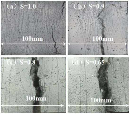 Cracks in the bottom of specimen: (a) S = 1.0; (b) S = 0.9; (c) S = 0.8; (d) S = 0.65.