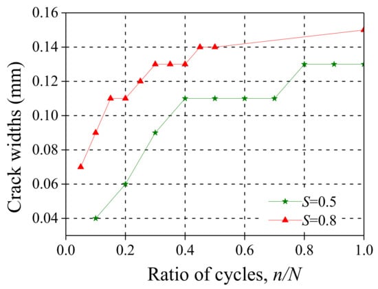 Figure 15 shows the cracks in the pure bending section at the bottom of the specimen after different stress levels of fatigue loading. Table 5 shows the average number of cracks at each stress level. As the stress level increases, the number of cracks gradually increased. Figure 16 further shows the crack width development under fatigue loading. It is seen that the crack width increases as the fatigue cycles increase; thus the crack width at S = 0.8 was significantly larger than that at S = 0.5, resulting in a significant decrease of the fatigue life as shown in Table 6.
