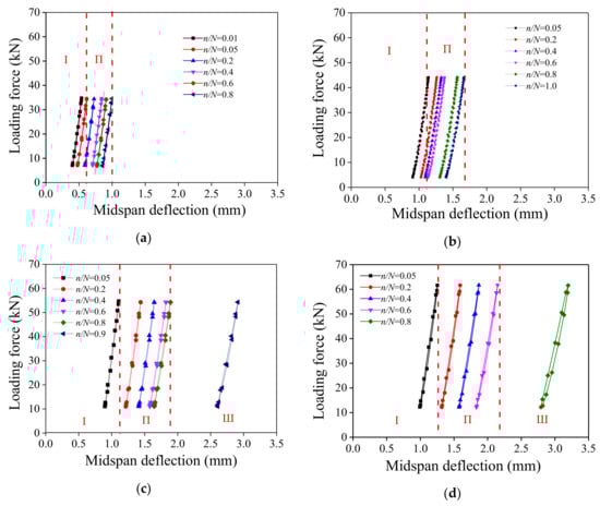 The hysteresis curves of the UHP-ECC at different fatigue stress levels are shown in Figure 17 where the aforementioned three deformation stages are also identified as Stage I (rapid deformation), Stage II (deformation stabilization), and Stage III (instability and failure), depending on the fatigue stress. With the increase of the fatigue stress level, the mid-span deflection was mainly distributed in a region ranging between 0.25 and 1.0 mm at S = 0.5 as well as between 1.0 and 3.0 mm at S = 0.9, respectively. Most of the load cycles took place in Stage II, and the load-midspan deflection curves exhibit a linear characteristic.