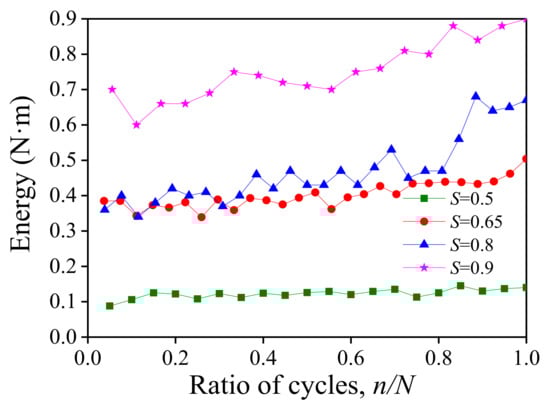 Moreover, with the increase of the fatigue loading cycle especially when the deformation of the UHP-ECC entered Stage III at high stress level, the single hysteresis loop became fuller, and more energy was dissipated. The energy dissipation in each hysteresis curve during each cycle was calculated. The curves of the dissipated energy show how the cycle ratio under different stress levels were obtained, as shown in Figure 18, where the dissipated energy in a single cycle increased slowly with the cycle ratio over the entire fatigue life cycle, and the rate also increased slightly with the stress levels.
