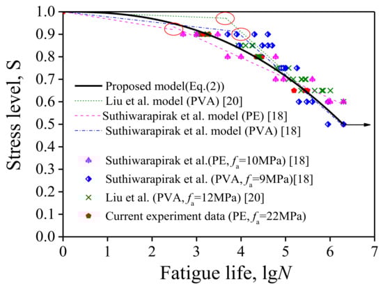The S-N curve obtained by nonlinear fitting is shown in Figure 19 where the existing bilinear fatigue life models were evaluated and compared. Notably, the arrow in the figure means that the specimen was not broken after 2 million fatigue cycles, and the test was, thus, stopped.