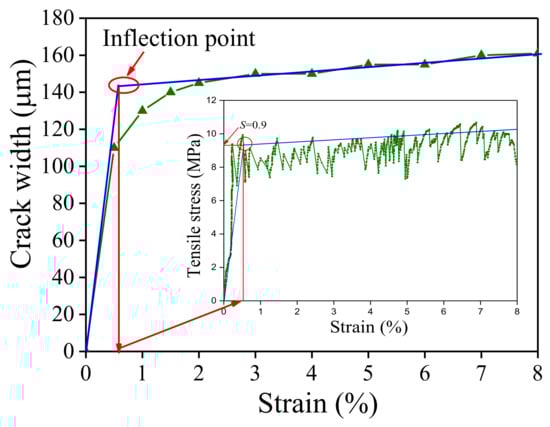 A tensile test was first conducted to obtain the tensile mechanical properties of ECCs. Three dog-bone shaped specimens were tested. The dimensions of the dog-bone shaped specimen and the loading device are shown in Figure 3. In the gauge segment, two linear variable differential transformers (LVDTs) were used to measure the tensile deformation for the calculation of real-time strain. The tensile stress-strain curve is shown in Figure 4. In the uniaxial tensile test, the crack widths were measured at the specified tensile displacement using a crack-width gauge, and the average crack width was calculated to obtain a relationship between the average crack width and the strain, as shown in Figure 5. Figure 5 shows that two significant stages can be distinguished where Stage I is defined as the crack width’s rapidly increasing stage, and Stage II is the crack width stable development stage. Due to the presence of fiber bridging, the crack width of UHP-ECC was controlled under 160 μm.