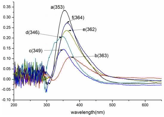 UV/Vis spectra of lignin and its esters: (a) original lignin; (b) acetylated lignin (1.5 h); (c) propionylated lignin (1.5 h); (d) butyrated lignin (2 h); (e) succinylated lignin (2 h); (f) maleylated lignin (2 h).