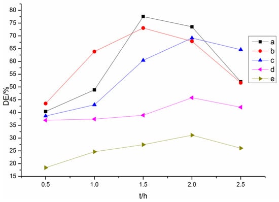 Degrees of esterification (Des) of lignin esters with different reaction times: (a) acetylated lignin; (b) propionylated lignin; (c) butyrated lignin; (d) succinylated lignin; (e) maleylated lignin.