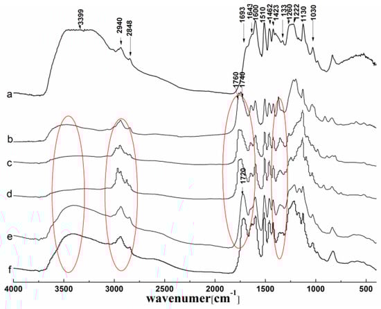 FTIR spectra of lignin and its esters: (a) original lignin; (b) acetylated lignin (1.5 h); (c) propionylated lignin (1.5 h); (d) butyrated lignin (2 h); (e) succinylated lignin (2 h); (f) maleylated lignin (2 h).