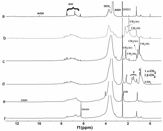 1H NMR spectra of lignin and its esters: (a) original lignin; (b) acetylated lignin (1.5 h); (c) propionylated lignin (1.5 h); (d) butyrated lignin (2 h); (e) succinylated lignin (2 h); (f) maleylated lignin (2 h).
