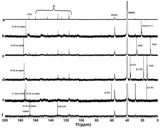 13C NMR spectra of lignin and its esters: (a) original lignin; (b) acetylated lignin (1.5 h); (c) propionylated lignin (1.5 h); (d) butyrated lignin (2 h); (e) succinylated lignin (2 h); (f) maleylated lignin (2 h).