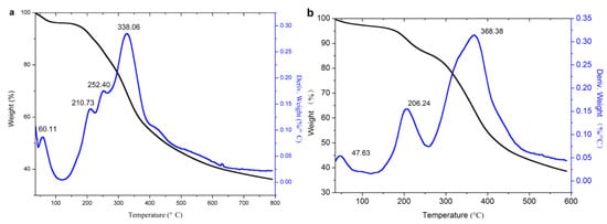 It can be seen from the DTG curves that the weightlessness of lignin and its esters were divided into three stages, and the related parameters are listed in Table 1. The first stage (30–125 °C) was the evaporation of water, which could be proved from DSC analysis in that it disappeared in the curves of the second heating. In this stage, the original lignin had an obvious peak, due to its strong hydrophilicity, because it contains a large number of hydroxyl groups. The acylated lignins prepared with non-cyclic anhydrides (except acetic anhydride) had nearly no peak, due to the weak hydrophilicity, because esterification consumed a large number of hydroxyl groups and introduced alkyl groups. The acetylated lignin still had an apparent peak for the improvement of hydrophilicity by short alkyl groups, but it was not as good as with the long alkyl groups. The acylated lignins prepared with cyclic anhydrides still had apparent peaks due to their strong hydrophilicity for the introduction of carboxyl groups and the consumption of hydroxyl groups occurred at the same time during the esterification. The second stage (125–268 °C) was caused by the degradation of the phenylpropanoid side chain of lignin [36]. In this stage, the original lignin had two peaks, while the acylated lignins except maleylated lignin had single peaks, which might have resulted from that the consumption of hydroxyl groups, which simplified the functional groups in the side chains of the lignin. Because of its unsaturated double bonds, maleylated lignin had a distinguishable decomposition peak around 167 °C. The third stage (268–600 °C) was the decomposition stage of the majority, during which the main units in the lignin esters were decomposed into small molecules, such as methane, ethane, propane, carbon monoxide, carbon dioxide, and hydrogen, etc. [4]. The propionylated and butyrated lignins had two peaks, which might be ascribed to the ester groups, and the main units had different stabilities due to the long chains of ester substituents. As acetyl groups were too short to have differences in stability from the main units, the acetylated lignin had a single peak. For succinylated and maleylated lignins, the ester substituents with carboxylic groups could form hydrogen bonding with the main units, and they easily formed a whole, so they still had a single peak.