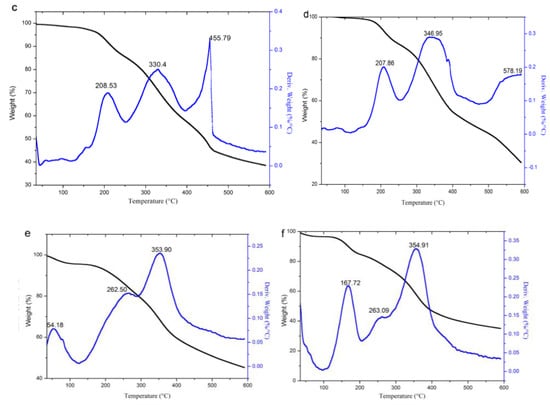 TG analysis of lignin and its esters: (a) original lignin; (b) acetylated lignin (1.5 h); (c) propionylated lignin (1.5 h); (d) butyrated lignin (2 h); (e) succinylated lignin (2 h); (f) maleylated lignin (2 h).