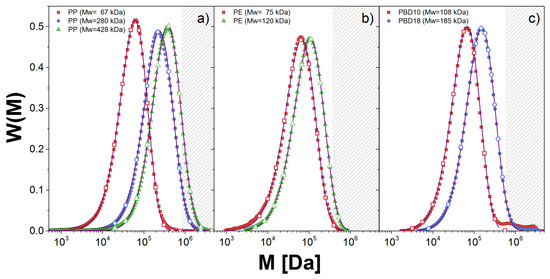 Molecular weight distribution, , obtained from GPC measurements (symbols) for: (a) PP; (b) PE; and (c) PBD melts. The fitting to the GEX distribution is shown with solid lines. The discrete distribution used in the DSM approach is given by the empty symbols.