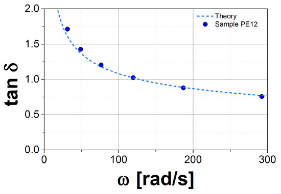 In the first step, we plot the loss tangent, , as a function of frequency, , for both the experimental data and the theory. This function is independent of , so we can estimate , or equivalently k, by matching the theoretical prediction to the experimental data in the vicinity of the crossover point (CP), and . In Figure 2, we show this plot for sample PE12. This procedure eliminates uncertainties in from fitting k. The second step consists in matching the theory to the experimental data in the G* axis, again in the vicinity of the crossover point. By using this method, is well defined for this model, but the obtained values may not be in agreement with the conventional methods used in other tube models (see, for example, Ref. [27]).