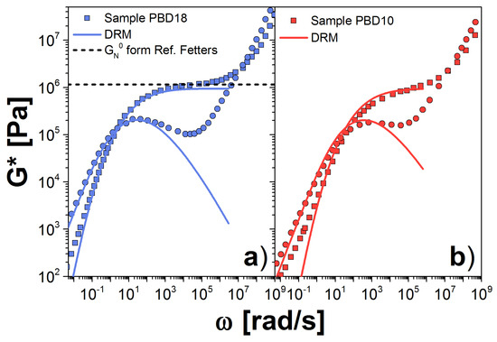 As a check, we use the value obtained from the PBD18 sample to calculate G* for the sample PBD10, shown in Figure 3b. Again, we observe good agreement between theory and experiment, suggesting consistency between the samples, and between the data and the theory. However, we found an important deviation in the terminal zone, which is due to large chains in the sample, represented as a shoulder in the . The high molecular weight contribution is larger in the PBD10 sample than in the PBD18 sample.