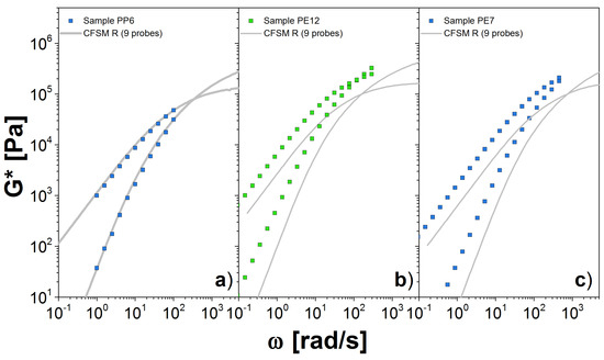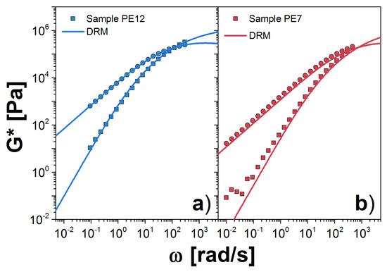 Finally, in Figure 8b,c, we show our results for the PE samples. The value for was found from DRM fit to PE12. For both cases, we computed the G* with only 9 probes, from the 10 probes that we need to correctly represent the , that is because the calculation for the high molecular weight probe is computationally expensive. For PE12, we observe a reasonable agreement with the experimental measurements at low values. However, there are some differences for values close to the crossover point. Similar observations apply for PE7. It is possible that additional high-molecular-probes are necessary, but it seems more likely that the estimate for the plateau modulus obtained from DRM is not accurate. The unfortunate lack of any clear plateau for the PE data make a definitive conclusion on this point impossible.