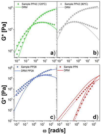 Dynamic and loss moduli, and , respectively, were determined through small amplitude oscillatory shear (SAOS) experiments. The measurements were performed at 120 and 80 C for the PP and at 190 C for the PE.