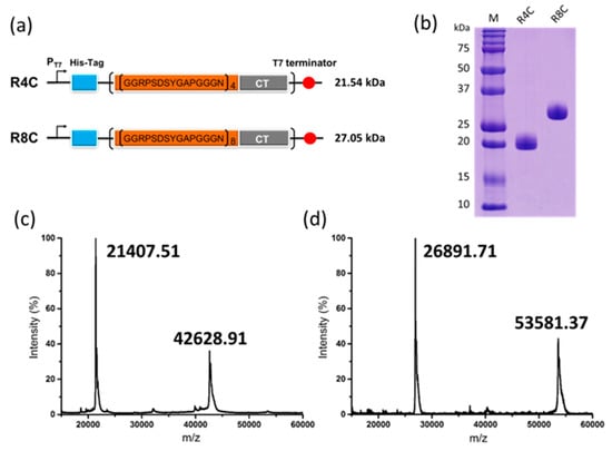(a) Constructs of recombinant proteins R4C and R8C, with theoretical molecular weights calculated using the ProtParam tool (http://web.expasy.org/protparam/); (b) Denaturing SDS-PAGE analysis of the purified protein copolymers. MALDI-TOF mass spectra of (c) R4C and (d) R8C, which existed as monomer and homodimer under nondenaturing conditions.