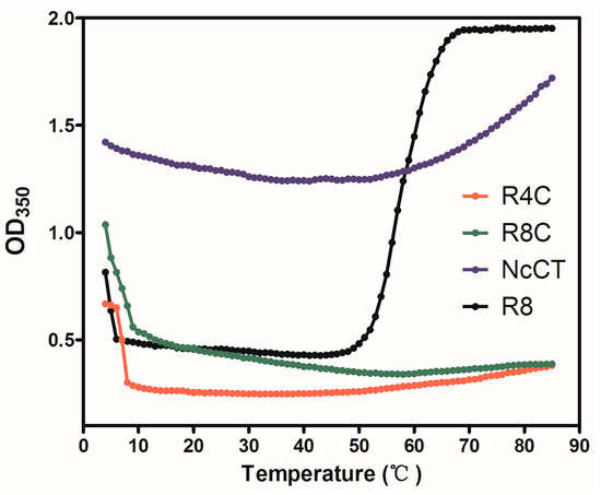 To examine whether the incorporation of resilin-like blocks affected the thermoresponsive behavior, changes in optical density were monitored at 350 nm (OD350) of the protein solutions over a broad range of temperatures (Figure 2). Here, a resilin-like polypeptide having eight consensus motifs (R8) and NcCT, which had comparable theoretical molecular weights, were included as controls. As expected, R8 exhibited typical dual-phase transition behavior with UCST and LCST of ~4 °C and ~60 °C, respectively, which coincided well with another, larger resilin-like polypeptide (R32) in our previous study [28]. As another control, the turbidity of NcCT increased moderately upon chilling, possibly as a result of relatively weak hydrogen bonding and hydrophobic interaction between the folded protein molecules. However, a pronounced increase in turbidity was observed when the NcCT solution was heated above 60 °C, which might be due to a strong hydrophobic interaction between the exposed hydrophobic patches resulting from partial unfolding of the protein at high temperatures.