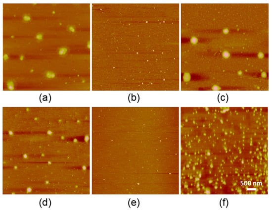 Representative atomic force microscopy (AFM) images of the nanostructures for R4C at (a) 4 °C; (b) 37 °C; and (c) 65 °C; and for R8C at (d) 4 °C; (e) 37 °C; and (f) 65 °C. Freshly prepared solution (10 μL) of each protein at a concentration of 1 μg mL−1 was cast on a mica surface and allowed to dry at the respective temperatures before AFM analysis.