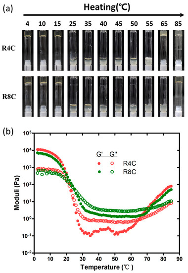 (a) Test of formation of hydrogels by R4C and R8C. Vials containing 15% (w/v) protein solutions were incubated for 10 min at the indicated temperatures and then inverted for image collection; (b) Oscillatory rheological analysis of R4C and R8C at a protein concentration of 20% (w/v). The temperature sweeps were performed with a heating rate of 2 °C min−1.