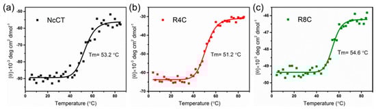 Far-UV circular dichroism (CD) unfolding data at 222 nm for (a) NcCT; (b) R4C; (c) R8C at a concentration of 0.2 mg mL−1. Solid line represents the best sigmoidal curve fit for visualization.