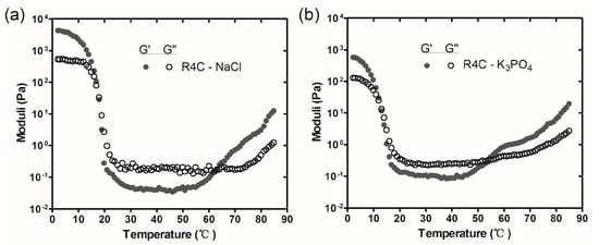 Oscillatory rheological profiles of 20% (w/v) R4C in 20 mM phosphate buffer (pH 7.2) supplemented with (a) 75 mM NaCl or (b) 75 mM K3PO4. The temperature sweeps were performed with a heating rate of 2 °C min−1.