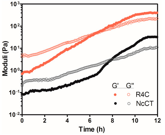 Oscillatory rheological profiles for 15% (w/v) protein solutions of R4C and NcCT as a function of time. The time sweeps were performed at 37 °C with a strain of 1% and a frequency of 1 Hz.