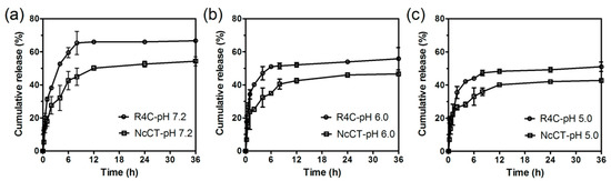 Since resilin was responsive to pH, we next explored whether the above resilin-CT copolymer hydrogel allowed pH-dependent release of drugs. Here we selected as a model drug molecule rhodamine B, which is highly hydrophilic and exhibits strong fluorescent signals in aqueous solutions so that the molecule can be conveniently monitored by fluorescence spectrometry. Hence, R4C was mixed with rhodamine B, incubated overnight at 37 °C to form hydrogels, and then exposed to phosphate buffered saline at different physiologically relevant pH levels to trigger the release of rhodamine B from the hydrogels (Figure 8). For both R4C and NcCT hydrogels, there was a general trend that the cumulative release of rhodamine B was enhanced with an increase in the solution’s pH value, showing pH-sensitive behavior. For example, the R4C hydrogel released 66.0% of the loaded dye at 12 h in the pH 7.2 buffer, whereas there was only 48.3% release from the hydrogel at pH 5.0. In addition, at all three pH levels, the R4C hydrogel showed more rapid response compared with the NcCT hydrogel, indicating that the incorporation of resilin blocks in the copolymer favored pH-responsive release of the hydrophilic drug model. Taken together, the results prove that the resilin-CT copolymer hydrogels may be useful for pH-responsive delivery of drugs. Nonetheless, it should be noted that the release did not reach 100% in the above in vitro test, which might be due to the nonspecific binding between rhodamine B and protein macromolecules. It is envisioned that the hydrogel system might allow complete release of the model drug molecule in vivo due to time-dependent gradual biodegradation of the protein network.