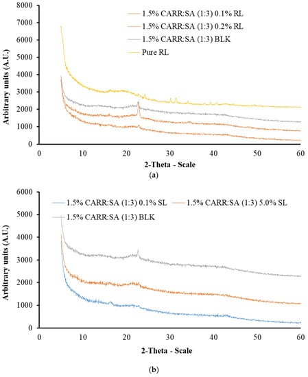 XRD diffractograms of (a) BLK and pure RL and RL loaded 1.5% CARR:SA (1:3) wafers and (b) BLK 1.5% CARR:SA (1:3) and SL loaded 1.5% CARR:SA (1:3) wafers.