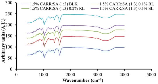 ATR-FTIR spectra of 1.5% CARR:SA (1:3) BLK and BSs loaded 1.5% CARR:SA (1:3) wafers.