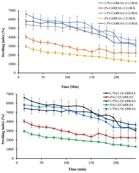 The driving force for swelling is the entropy increase when water diffuses into the polymeric matrix. A formulation prepared from hydrophobic polymers has a non-favored interaction with water and does not swell much, while formulations prepared from hydrophilic polymers such as CARR and SA absorb large amounts of water and consequently swell to a greater extent. Swelling brings about tension within the gel network by stretching it and hence, lowers the entropy. Swelling also has an impact on drug release and a complex interaction between diffusion, dissolution and erosion mechanisms has been used to explain drug release from most hydrophilic matrices [46]. Fluid uptake (swelling) of the preliminary wafers prepared from 1% to 3% gels of only CARR showed erosion in less than one hour, which led to the decision to formulate composite wafers comprising CARR and SA polymers. During the preliminary swelling studies, the swelling capacity was observed to increase with increasing concentration of SA. However, the swelling of the samples reached the maximum value within 30 min of incubation in the swelling medium (Figure 4) after which the matrix begun to disintegrate. Among the different ratios of CARR:SA analyzed, maximum swelling capacity was observed in 1.5% CARR:SA (1:1). The 1.5% CARR:SA (1:3) BLK wafers showed maximum swelling capacity of 5825(±169)% which decreased to 2975(±94)% in 2% CARR:SA (1:2) BLK wafers, which may be due to the repulsive forces between the negatives charges of sulphate and carboxylate groups. Consequently, results obtained from swelling in conjunction with other characterization techniques led to the selection of 1.5% CARR:SA (1:3) for BSs loading.