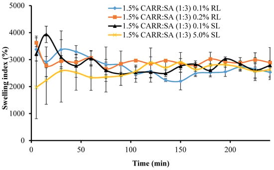 Swelling profiles in SWF, pH 7.5 of 1.5% CARR:SA (1:3) wafers loaded with 0.1% RL, 0.2% RL, 0.1% SL and 5% SL.