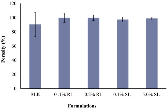 Porous wound dressings have the advantage of higher exudate uptake. The difference in the pore analysis of BLK and BSs loaded wafers was statistically significant (p < 0.05) which does not agree with the SEM analysis, and this may be because the wafer pores created by lyophilization result in a complex architecture of void space which may have been displaced during the actual porosity measurements using the ethanol displacement method. However, no statistical difference (p > 0.05) was observed between the different BSs (0.1% RL, 0.2% RL, 0.1% SL and 5% SL)-loaded wafers.