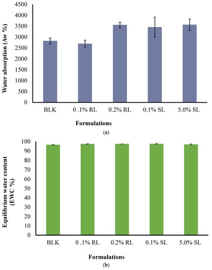 Comparison of (a) the water absorption (Aw) and (b) the equilibrium water content (EWC) of optimized BLK and BSs loaded wafers.