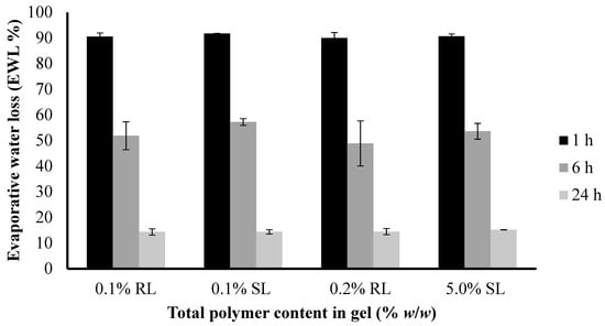 The SWF were drained from the same lyophilized wafer samples that had been incubated for Aw and EWC after 24 h, measured and dried in the oven at 37 °C for another 24 h. The weight of the dried samples was recorded hourly for 6 h with a final reading after 24 h. Evaporative water loss (EWL) was calculated according to Equation (5) [36]: