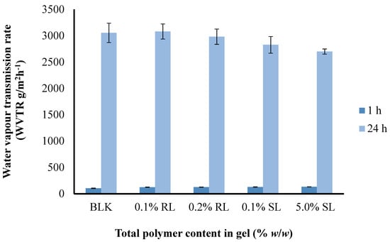 The WVTR observed after 1 h ranged from (87.53–105.07) g/m2 h−1 and after 24 h from (2777–3082) g/m2 day−1 for 1.5% CARR:SA (1:3) BLK and BSs loaded wafers, respectively (Supplementary data Table S8). There was no statistical difference (p > 0.05) observed between the different BSs (0.1% RL, 0.2% RL, 0.1% SL and 5% SL)-loaded wafers prepared from the optimized 1.5% CARR:SA (1:3) gels. It has been recommended that a rate of 2000–2500 g/m2 day−1 would provide an adequate level of moisture without risk of wound dehydration [48]. Based on the above observations, it can be concluded that WVTR of all the samples falls above the prescribed range of WVTR; therefore, the BSs-loaded wafers in this study may be useful in the case of wounds with abnormally high exudates.
