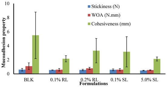 The stickiness, work of adhesion (WOA) and cohesiveness of BLK and BSs loaded wafers are presented in (Figure 10). The maximum stickiness observed for single CARR and SA wafers was 0.34 and 0.31 N, respectively, at 1% w/w total polymer content in gel. The stickiness of optimized 1.5% CARR:SA (1:3) was 0.60 N. Interestingly, the highest stickiness was observed in single 1.5% CARR wafers at 0.81 N. Generally, BSs reduced the stickiness of 1.5% CARR:SA (1:3).