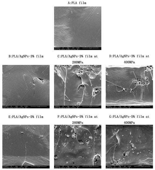 Effect of high pressure treatment on the microstructure of poly (lactic acid) (PLA)/silver nanoparticles (AgNPs) nanocomposite films (magnification: 10,000×): (A) PLA film; (B–D) PLA/AgNPs-3 film treated at 0, 200 and 400 MPa, respectively; (E–G) PLA/AgNPs-5 film treated at 0, 200 and 400 MPa, respectively.
