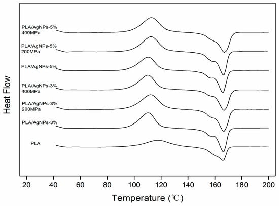 Effect of high pressure treatment on the differential scanning calorimetry (DSC) thermograms of PLA/AgNPs nanocomposite films (PLA film; PLA/AgNPs-3 film treated at 0, 200 and 400 MPa; PLA/AgNPs-5 film treated at 0, 200 and 400 MPa, respectively).