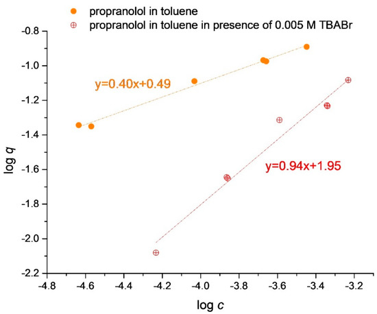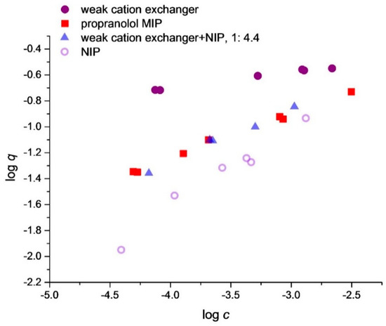 where c0 and c are the initial and the equilibrium solution concentrations [M] of the analyte, respectively, F is the phase ratio (solution [mL] to polymer [g] ratio). The equilibrium adsorbed concentration (q) was plotted against the equilibrium solution concentration (c) of the respective compounds in a log c–log q plot [39].