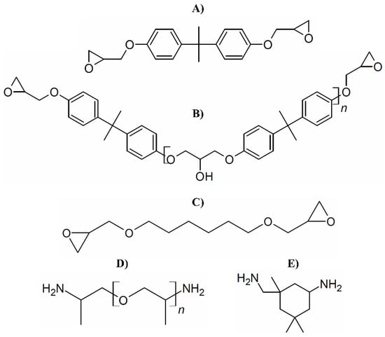 Molecular structures of epoxy and hardener components: (A) DGEBA monomer; (B) DGEBA oligomer (n = 1–2); (C) HDDGE; (D) POPA; (E) IPDA.