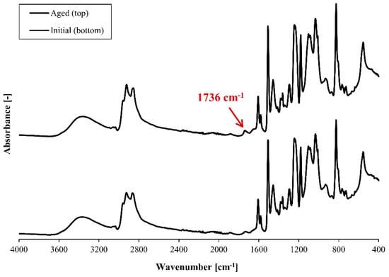 Increase in the intensity of the carbonyl group peak (νC=O; 1730–1740 cm−1) [4,8,10,28,39,40], for aged epoxy, is related to an oxidation process taking place. Carbonyl formation can result from various pathways [28]. Thermo-oxidation involving chain scission and appearance of double bonds; carbonyl and amide species have been reported in DGEBA/IPDA and DGEBA/POPA systems [4,21,41]. Appearance of diphenylketones was reported in another work [46]. In this work, the appearance of amide species (C=O; 1644 cm−1 and N-H; 3325 cm−1) [8,43] and diphenylketones (C=O; 1660 cm−1) [46] due to thermo-oxidation was not observed. Double bond formation was not observed, as indicated by C=C bands close to 1600 cm−1 (1624 cm−1 and 1593 cm−1) [28].