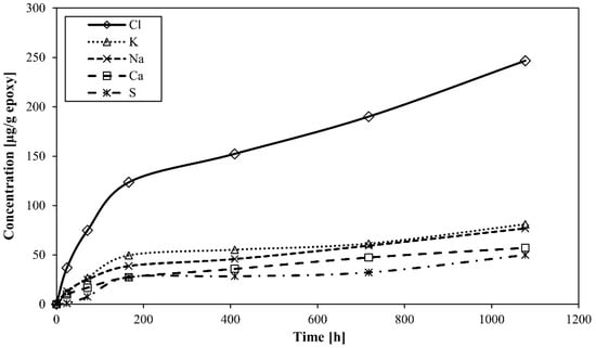 Elements (Ca, K, Na, Cl, S) were identified to be leached by the resin into contacting water during hygrothermal aging using HR-ICP-MS. The element release curves are shown in Figure 6, with Cl release being dominant.