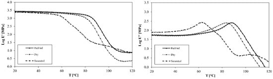 The changes at macromolecular scale have been investigated by Tg change. The glass transition temperature (Tg) of the initial, saturated, and redried epoxy was 81.7, 59.1, and 84.7 °C, respectively. Tg for saturated epoxy was much lower than for the dry and dried resin, due to plasticization [14]. The Tg of a redried epoxy was slightly higher than that of initial resin. In case of chain scission, a Tg value would have decreased [41], which was not observed. A slight increase in Tg of the dried material was likely due to polymer relaxation [13], minor thermo-oxidative crosslinking [7,27], or leaching of plasticizing compounds. The tensile storage and loss moduli in a temperature sweep range from 20 to 120 °C are presented in Figure 8.