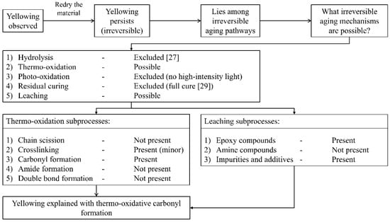 In this work, photo-oxidative effects were avoided by conducting experiments in the absence of high-intensity light sources [5,6]. For the studied material, no hydrolysis occurred [14]. To avoid residual curing, the material was fully cured as was indicated by the total disappearance of exothermal signal via differential scanning calorimetry (DSC) [4,24]. Two runs were performed: The first run was at 80 °C for 16 h, and the second heating cycle was performed at 80 °C for 1 h, showing that no further hardening occurs. Based on this, hydrolysis, photo-oxidation, and residual curing were excluded, whilst thermo-oxidation and leaching were investigated further, in respect to the yellowing.