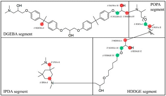 Noteworthy that all three reactive sites (δ+DGEBA-II, δ+POPA-I, and δ+HDDGE-III) involved in carbonyl formation have similar structures. Whilst δ+POPA-I contains the polyoxypropylene moiety, the other two sites (δ+DGEBA-II and δ+HDDGE-III) are identical and contain the i-propanol moiety.