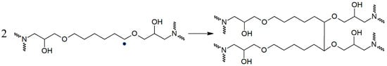 Tg can be regarded as a useful parameter revealing chemical changes for polymers [47]. The Tg of a redried epoxy (84.7 °C) was slightly higher than for the initial material (81.7 °C), indicating that no chain scission occurred [7,41]. A likely reason of a Tg increase was a combination of polymer relaxation [13], anti-plasticizing effect of leaching, and a minor crosslinking [7,27] of the HDDGE segments (site δ+HDDGE-IV). The thermo-oxidative crosslinking mechanism has been reported for an amine epoxy with a curing agent DGEBU similar to HDDGE in another work [27]. An analogous crosslinking mechanism of HDDGE segments is proposed in Scheme 1, involving sites δ+HDDGE-IV.