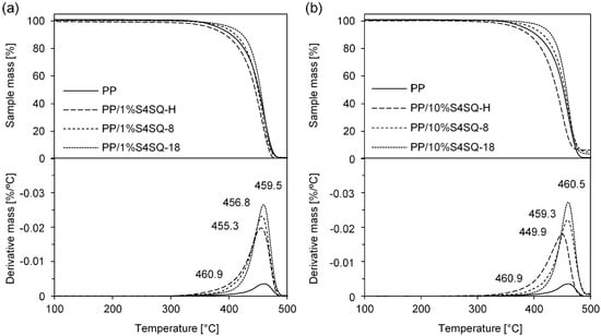 TG/DTG curves of neat PP as well as (a) PP/1%S4SQ and (b) PP/10%S4SQ composites (under nitrogen atmosphere).