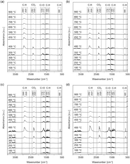 Thermal decomposition of both neat PP (Figure 4a) and PP/S4SQ composites (Figure 4b–d) started at about 300 °C. The main degradation products were alkenes, dienes and alkanes, as the absorbances at about 2964 (assigned to the stretching, asymmetric vibrations of -CH3 groups), 2925 (stretching, asymmetric vibrations of -CH2- groups), 1456 (deformation, asymmetric vibrations of -CH3 groups), 1374 (deformation, asymmetric vibrations of -CH3 groups) and 668 cm−1 (out of plane deformation vibrations of =CH- groups) were clearly visible at 300–600 °C. Moreover, sharp signals in the range of 1600–1800 cm−1 may be attributed to carbonyl-containing compounds such as aldehydes (1733 cm−1), ketones (1717 cm−1) and carboxylic acids (1705 cm−1). Furthermore, the release of nonflammable gases such as H2O, CO2 and CO could also be demonstrated by the signals at 3400–4000, 2300–2390 and 2080–2180 cm−1, respectively.