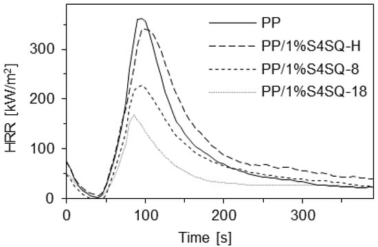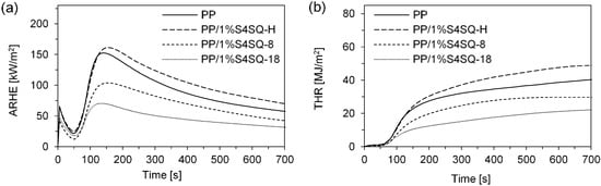Furthermore, the amount of the non-combustible fraction in the materials may be determined on the basis of the total heat release (THR) values. Once again, a decrease in THR was observed in the case of the PP/1%S4SQ-8 and PP/1%S4SQ-18 composites compared with neat PP (Figure 7b). A lower THR value may indicate that a part of the polymer is not completely combusted but that it could undergo a carbonization process. On the other hand, in the case of the PP/S4SQ-H composites, as well as the PP/S4SQ-8 and PP/S4SQ-18 with 5 and 10 wt % filler contents, the THR values were higher in comparison with neat PP.